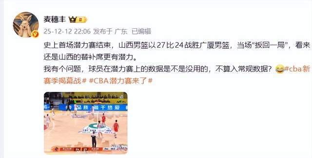 麦穗丰:“史上首场潜力赛结束,山西男篮以27比24战胜广厦男篮,当场“扳回一局”,看来还是山西的替补席更有潜力。我有个问题,球员在潜力赛上的数据是不是没用的,不算入常规数据?。”